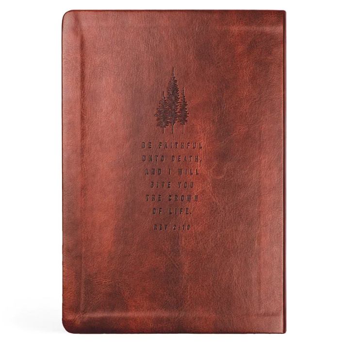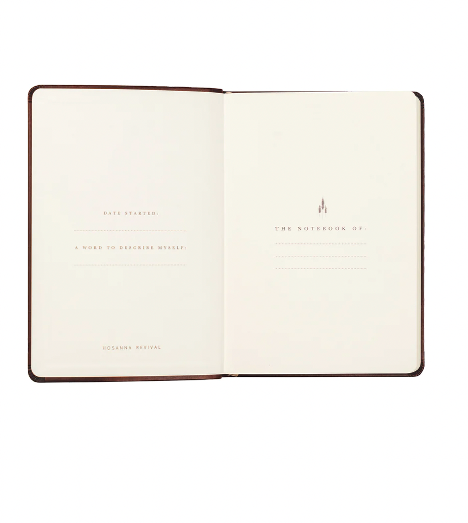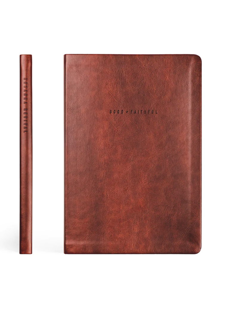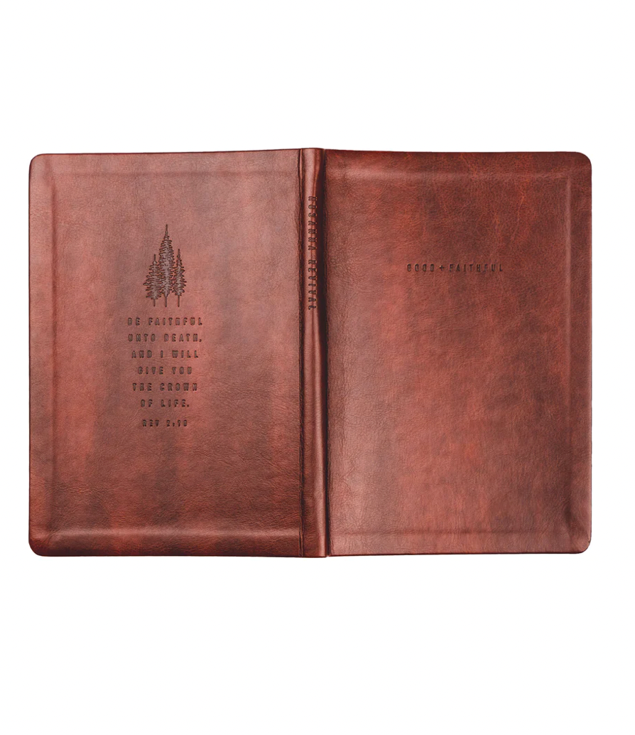 The Anchorage notebook is a simple, neutral design featuring the words “Good + Faithful” on the front with a trio of pine trees pressed into its back cover. The back also features Revelations 2:10. This notebook has a flexible, durable soft cover. Available with lined interior, we look forward to the day when this notebook is filled with your notes, dreams, and prayers.