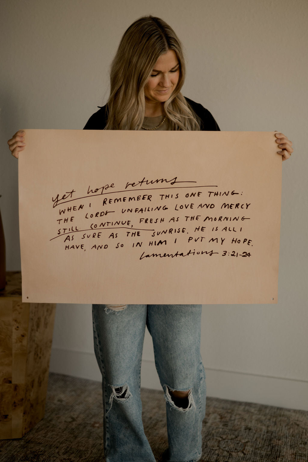 Holes are cut in each corner to hang with whatever hardware you choose. We like to use white painted nails for a bright, minimal look.