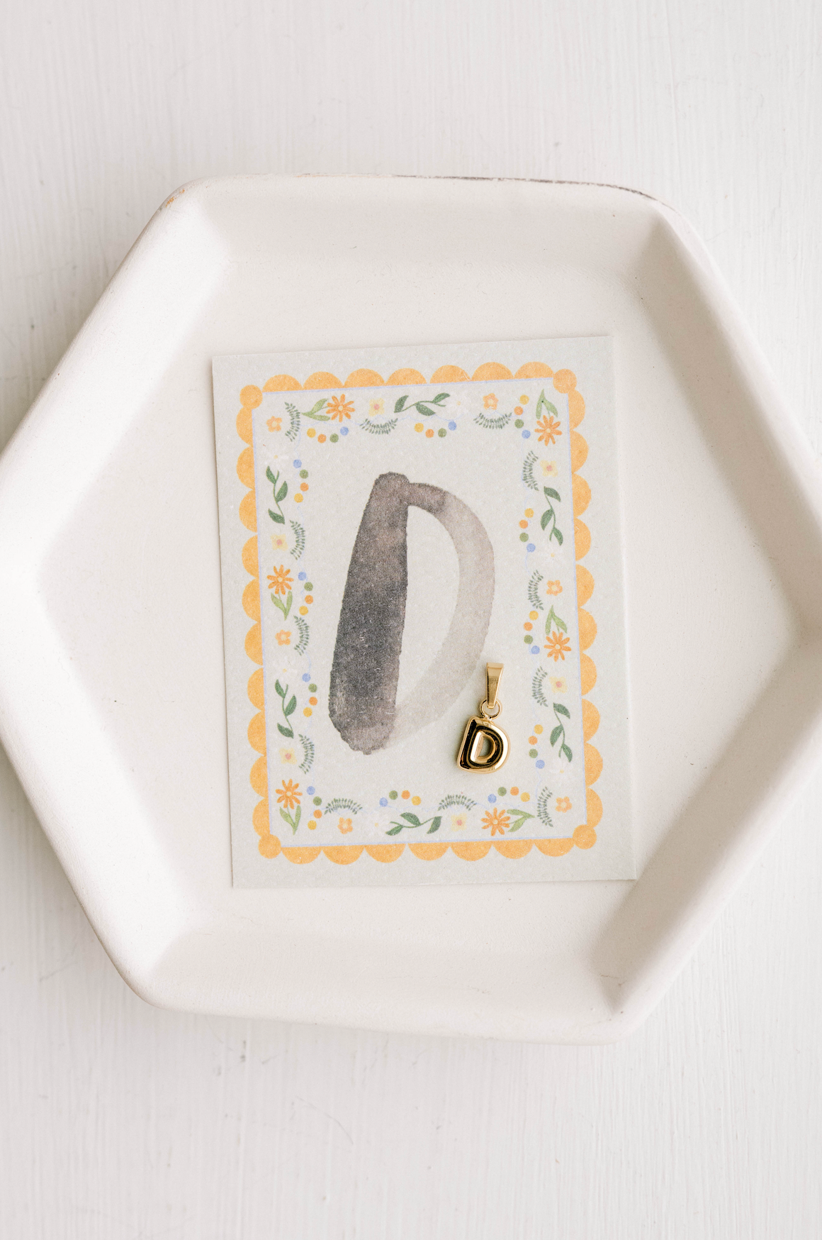 "D" Letter Charm with ring on a coordinating card.