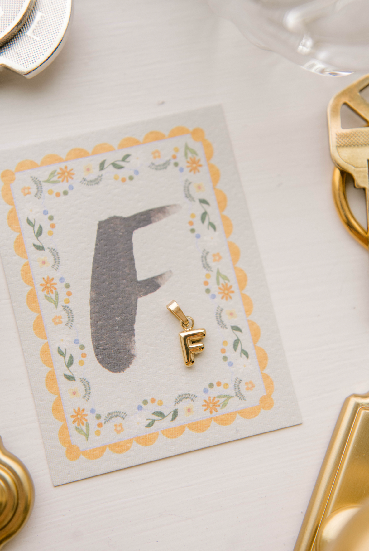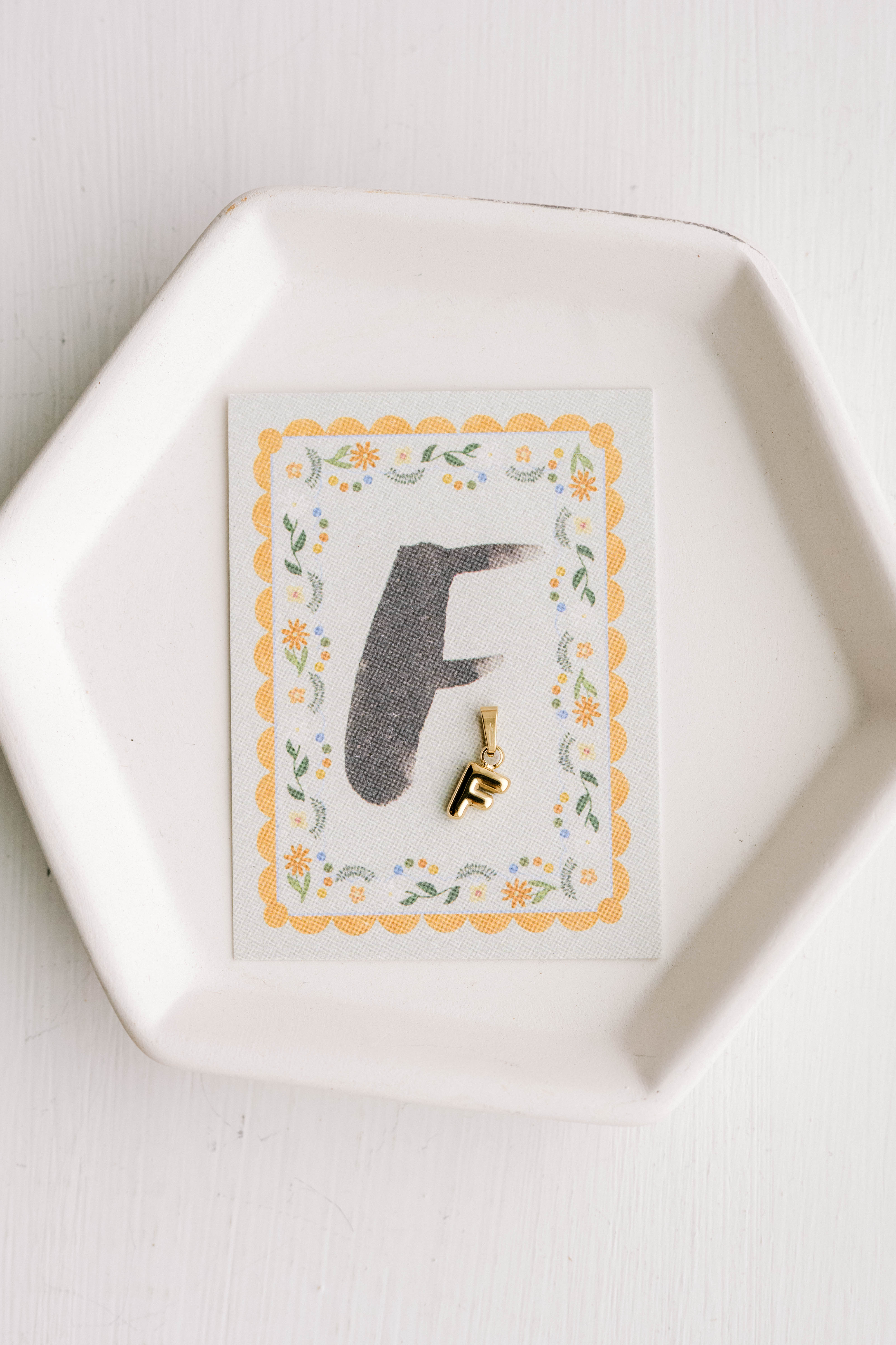 "F" Letter Charm with ring on a coordinating card.