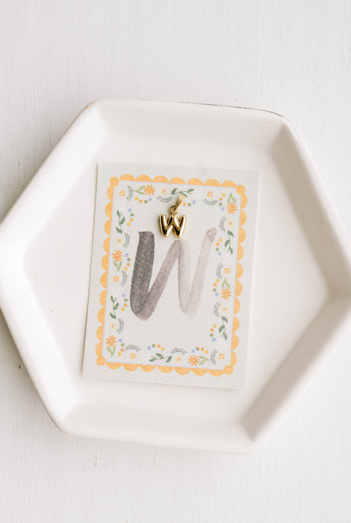 "W" Letter Charm with ring on a coordinating card.
