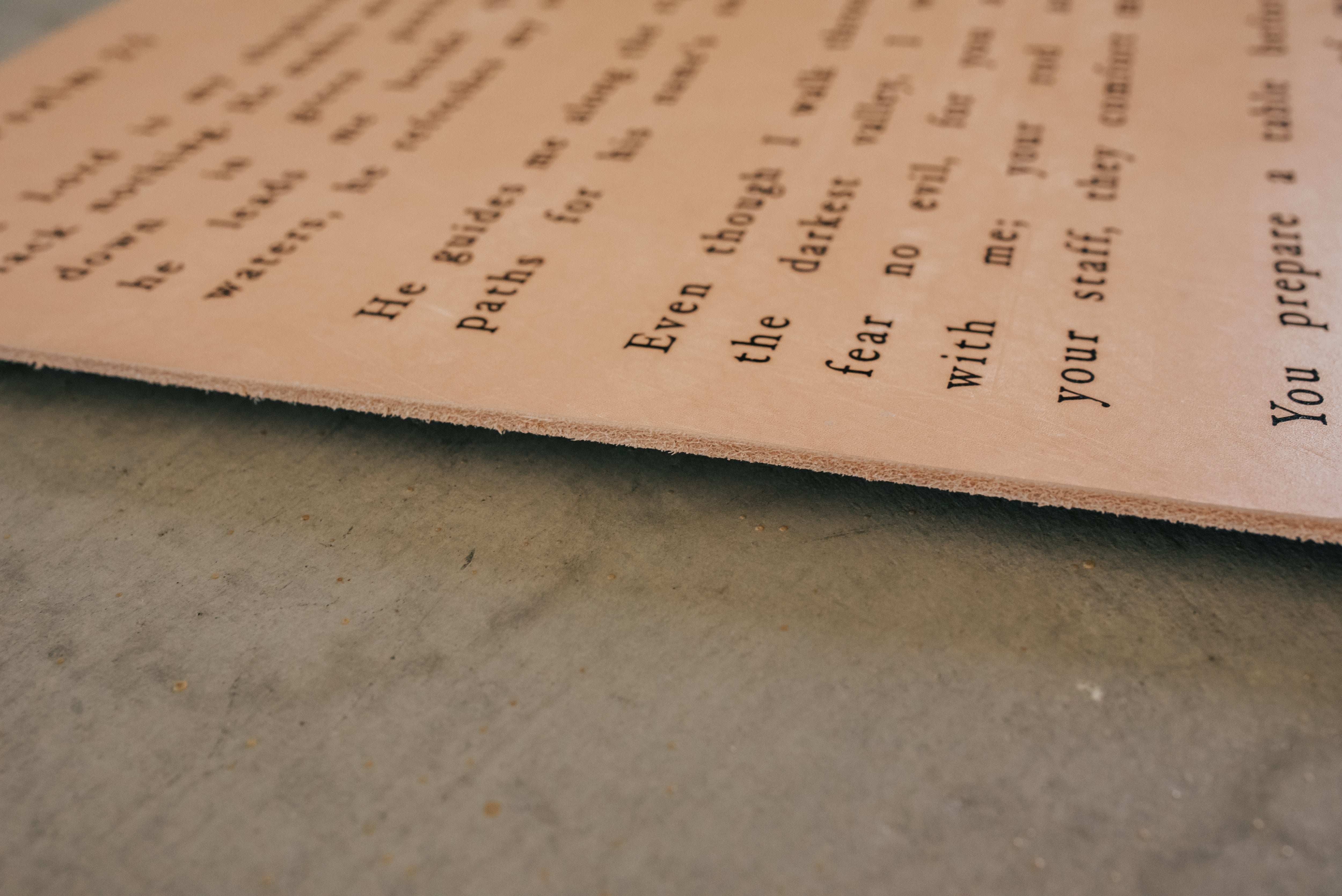 NOTE: Since leather is a natural material there will be slight variations in color and markings. This is vegetable tanned leather and will darken a little as it ages. The words are burned into the leather, so some soot might be present. We try our very best to remove all but if you run your fingers across the leather and you see a smudge, simply use a piece of tape to remove it. Press tape on top of the area with the smudge and lift. DO NOT use cleaner or water as it will stain.